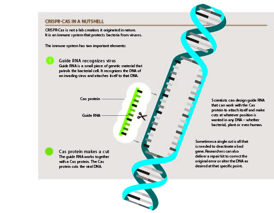 Guide RNA is a small piece of genetic material that patrols the bacterial cell. It recognizes the DNA of an invading virus and attaches itself to that DNA.