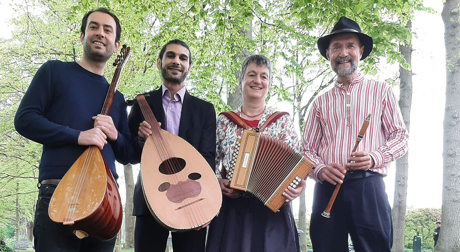 The name De Trekvogels (Migratory birds) refers to the fact that two of us came from far away to live in the Netherlands in safety and freedom. Making music together goes beyond borders of continents and cultures. Rami Mershed (ud), Keivan Habibi (divan/saz), Judica Lookman (diatonic accordion) and Bert Lotz (flute, cowhorn and shawn) together areDe Trekvogels.