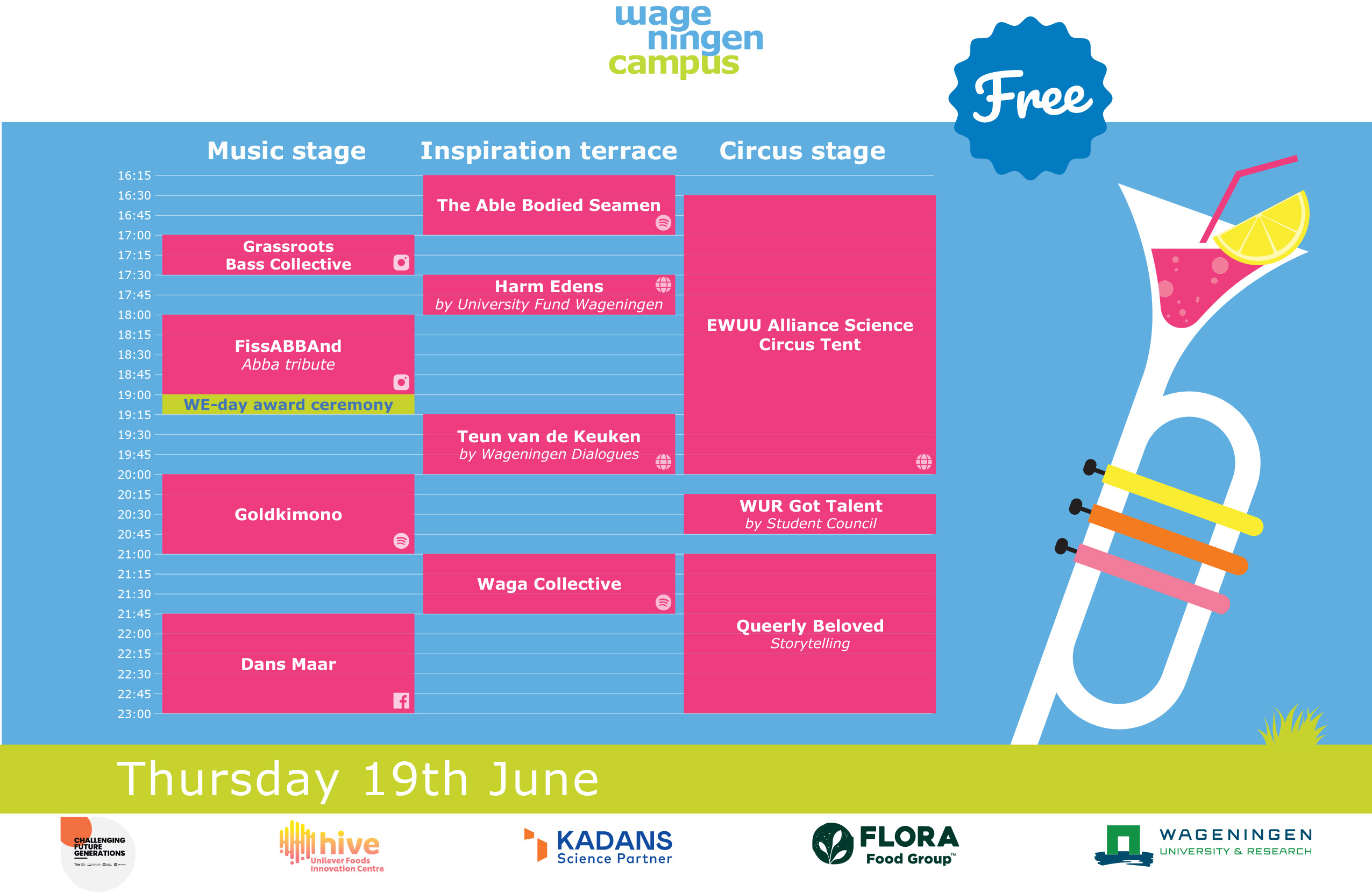 Compass, the WUR house caterer, is organising a wide range of tasty options. From crispy snacks to surprising world dishes, there is something for everyone. You can pay with festival tokens, which are on sale on the grounds.