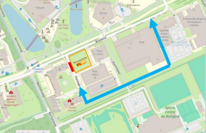 Because the Plantage is cordoned off on the Campus Plaza side, traffic will be routed via the connection from Bronland to the Plantage between Unilever/Flora Food Group (formerly Upfield) (see map). Due to the limited width, traffic controllers allow alternate traffic on the Plantage. Follow their instructions for a smooth transaction and keep in mind that this may lead to a longer travel time. Preferably park elsewhere on campus if you have to be at the daycare center (Prins Vleermuis), vaccination center or Healthcare Hub in this period.