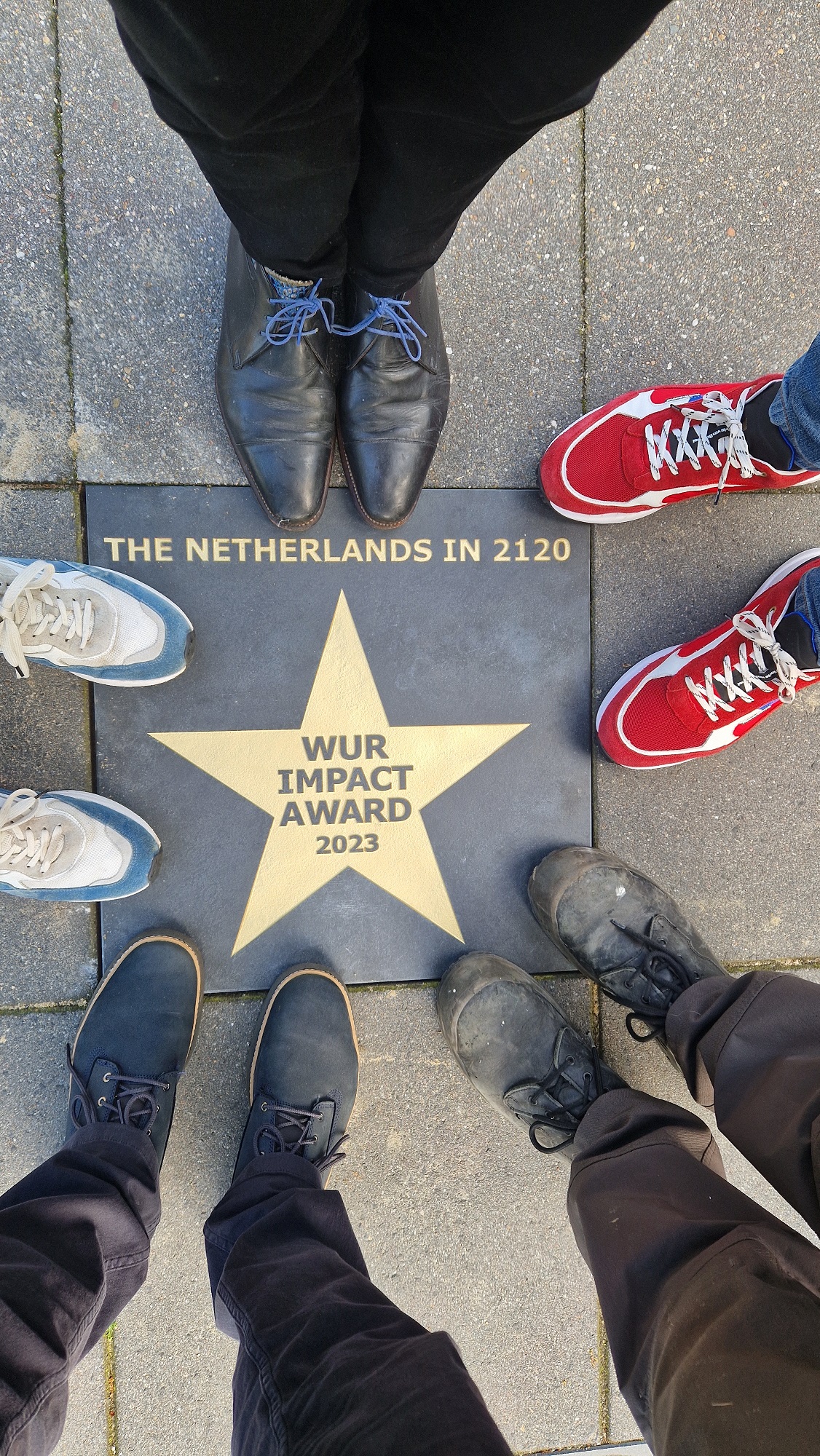 The team behind The Netherlands in 2120, the nature-based vision for the future of the Netherlands, received a tile in the Walk of Fame at Wageningen Campus. Last year they won the second edition of the WUR Impact Award 2023. Next week, they will passing the baton to a succeeding team that will receive the WUR Impact Award 2024.