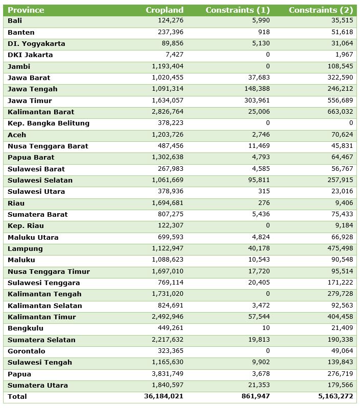 Table 1: Potential suitable areas (ha) for TSS systems in the provinces of Indonesia. The second column refers to current cropland (Fritz et al. 2015), the third and fourth column give the results when additional constraints are combined with current cropland.