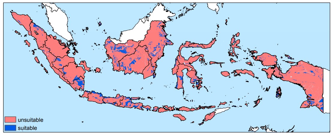 Maps showing the suitable areas, the climate variables, and soil and terrain characteristics for Indonesia are available via the links at the bottom.