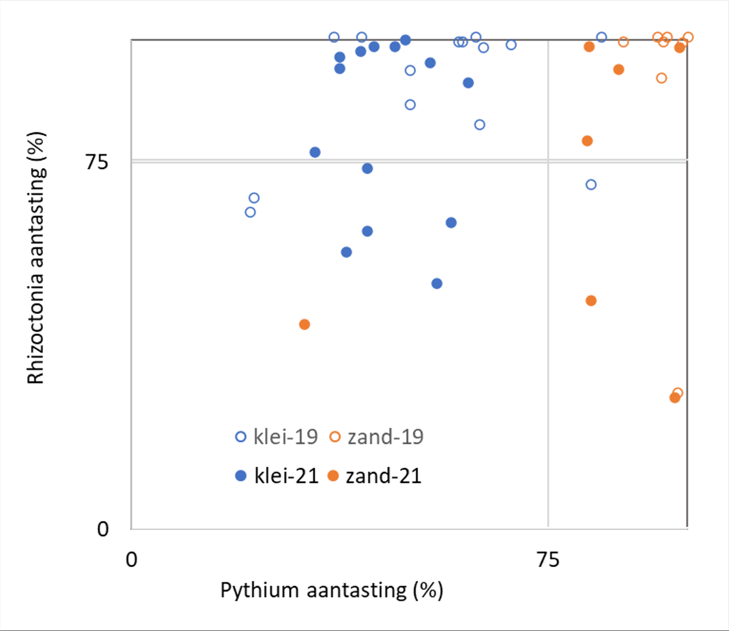 Als we een grond ziektewerend noemen bij een arbitraire grens van minder dan 75% aantasting, zijn er in 2019 twee gronden en in 2021 zes gronden ziektewerend voor zowel Pythium als Rhizoctonia. In totaal zijn vier gronden alleen ziektewerend tegen Rhizoctonia (rechtsonder) en 19 gronden alleen tegen Pythium (linksboven). De rest van de gronden was niet ziektewerend tegen een van beide pathogenen (rechtsboven). Na toevoeging van Pythium aan de grond was de aantasting veelal lager in klei- dan in zandgrond (zie figuur 1 op de horizontale as, blauw t.o.v. oranje). In zandgrond was de aantasting na toevoeging van Pythium meestal maximaal (meer dan 75% aantasting). Kleigrond is dus ziektewerender tegen Pythium dan zandgrond. Dit blijkt ook uit de gemiddelde waarden voor klei- en zandgrond (figuur 2). Opvallend is dat in de controles waar geen Pythium aan toegevoegd was, veel natuurlijke infectie van Pythium optrad in de zandgronden, maar niet in de kleigronden. Ook dit bevestigt dat zandgrond veel gevoeliger is voor Pythium-aantasting dan kleigrond.