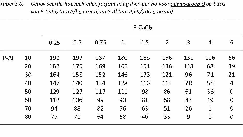 In de tabellen 3.0 t/m 3.4 zijn de fosfaatgiften vermeld die nodig zijn om gegeven de fosfaattoestand van de bodem op basis van P-AL en P-CaCl2 de economisch optimale opbrengst te bereiken met volvelds bemesting met fosfaat. Het advies op basis van deze beide indicatoren is onafhankelijk van grondsoort.
