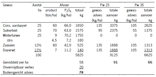 Bij Pw 25 zou bij bemesting volgens het gewasgericht advies gemiddeld over het bouwplan 91 kg P2O5 per ha moeten worden aangevoerd. Om het Pw-getal te handhaven moet 78 kg P2O5 per ha worden aangevoerd (gemiddelde afvoer + onvermijdbaar verlies). In dit geval zou moeten worden uitgegaan van het gewasgericht advies. N.B.: vanwege de fosfaat-gebruiksnorm mag gemiddeld per ha maar maximaal 75 kg P2O5 per ha worden toegediend.