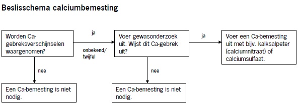 Calciumgebrek komt onder normale groeiomstandigheden vrijwel nooit voor. Daarom is het in principe niet nodig grond- en/of gewasonderzoek uit te voeren. Het risico dat calciumgebrek tóch optreedt is het grootst op lichte, kalkarme gronden met een (te) lage pH. Voor het advies over de gewenste pH van de bodem en bekalking, zie: pH en bekalking. Het risico van calciumgebrek op deze gronden zal toenemen door uitspoeling van calcium bij grote hoeveelheden neerslag. Verder kan calciumgebrek optreden in perioden van droogte en een gebrekkige vochtvoorziening. Zie het rapport: Effecten bemesting K, Mg, Ca, N en Cl en hun interacties op gewasopbrengst en -kwaliteit.