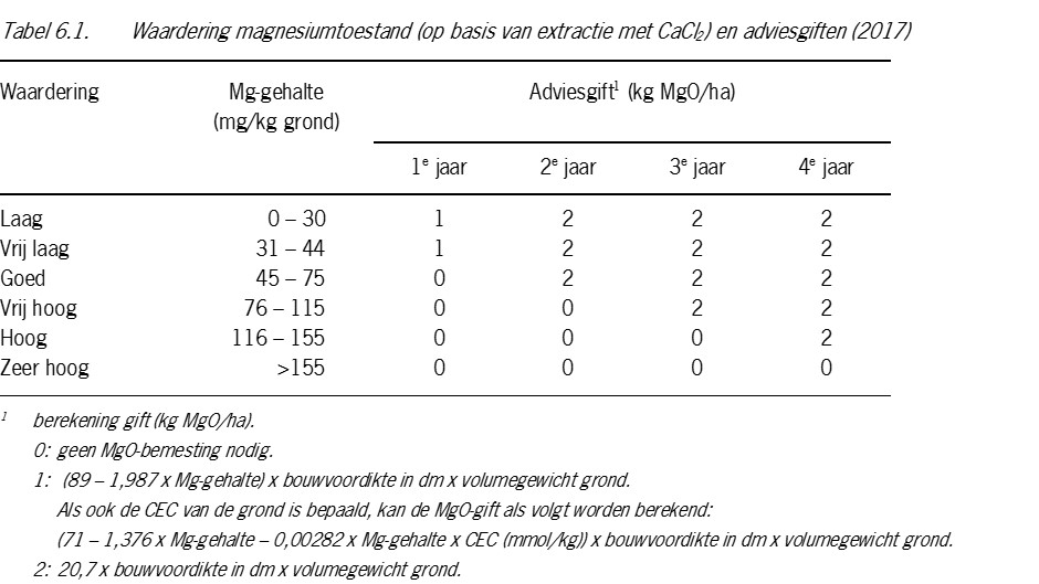 Als streefgetal geldt: 45 mg Mg/kg grond (op basis van extractie met CaCl2).