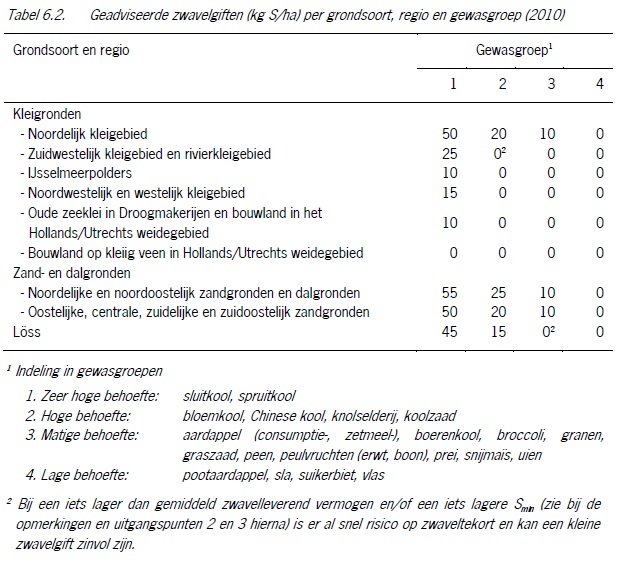 In tabel 6.2 zijn zwaveladviesgiften weergegeven, afhankelijk van de gewasbehoefte, de grondsoort en regio. De adviesgiften zijn gebaseerd op een gemiddeld zwavelleverend vermogen per grondsoort en regio en een lage Smin na de winter. De waarden waarmee is gerekend, zijn weergegeven onder ‘Opmerkingen en gehanteerde uitgangspunten in de zwavelbalans’. De gewassen zijn naar gelang hun zwavelbehoefte ingedeeld in vier categorieën.