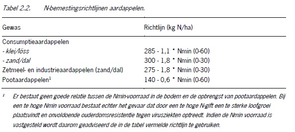 In Tabel 2.2 staan de N-bemestingsrichtlijnen voor aardappelen vermeld. Voor stikstofbijmestsystemen aardappel zie pagina Stikstofbijmestsysteem aardappel