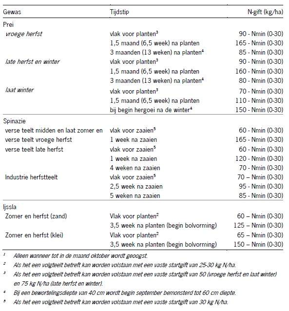 3. De bijmestgiften dienen te worden uitgevoerd met goed oplosbare, snelwerkende minerale N-meststoffen. Als een basisgift is uitgevoerd met langzaamwerkende meststoffen, moet worden ingeschat hoeveel N in een bepaalde periode vrijkomt. Informeer hiernaar bij de leverancier van de meststof.