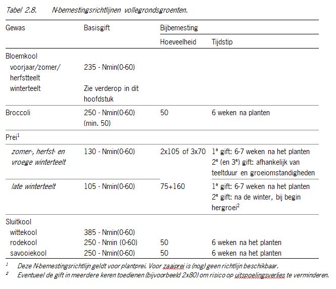 In Tabel 2.8 staan de N-bemestingsrichtlijnen voor voorraadbemesting van een groot aantal vollegrondsgroentengewassen vermeld. De richtlijnen voor winterbloemkool en rijenbemesting bij broccoli staan apart weergegeven in deze paragraaf.