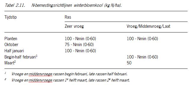 In Tabel 2.11 staan de N-bemestingsrichtlijnen voor winterbloemkool weergegeven.