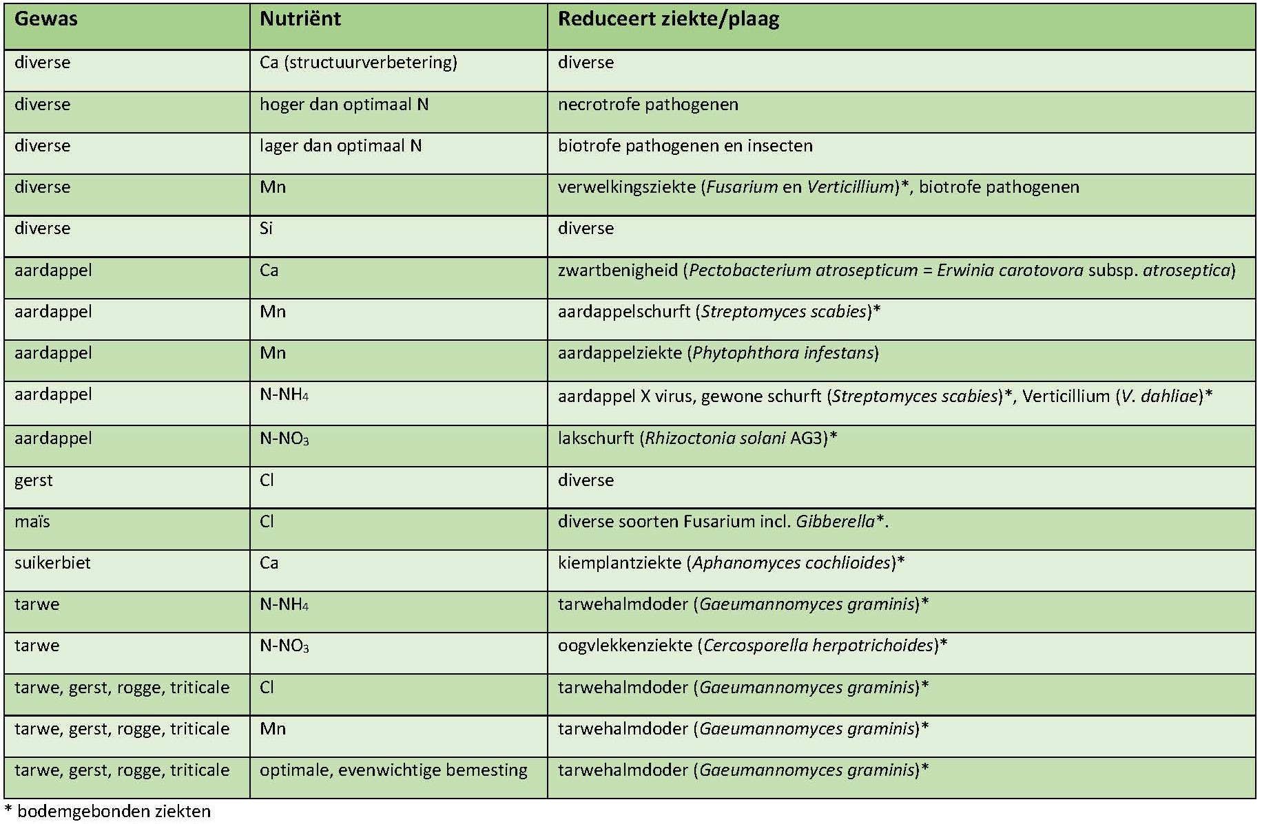 Een optimale bemesting voor de gewasgroei is tevens van belang voor de weerbaarheid tegen ziekten en plagen. Nutriëntentekorten verlagen de weerbaarheid. Een supra-optimale bemesting heeft beperkte invloed op de plantweerbaarheid.
